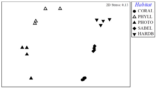 Nonmetric multidimensional scaling (nMDS) plot of molluscan assemblage, based on Bray-Curtis similarity matrix, of all replicates for each habitat.