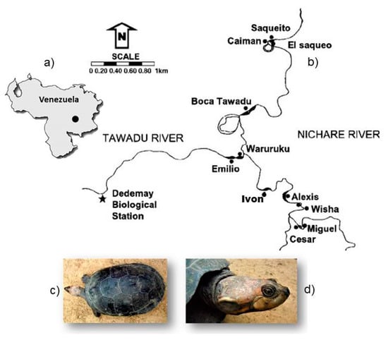 Map of Venezuela (study area in black dot, subpanel a) and map of the study area showing the 11 beaches that were monitored during nesting season 1999, 2000 and 2001 (El Saqueo = 6°23′39′′ N, 64°57′31′′ W; Caiman = 6°23′38′′ N, 64°57′36′′ W; Saqueito = 6°23′42′′ N, 64°57′19′′ W; Boca Tawadu = 6°22′01′′ N, 64°58′16′′ W; Waruruku = 6°21′02′′ N, 64°58′18′′ W; Emilio = 6°20′59′′ N, 64°58′29′′ W; Ivon = 6°20′12′′ N, 64°57′51′′ W; Alexis = 6°20′07′′ N, 64°57′27′′ W; Wisha = 6°19′ 47′′ N, 64°57′13′′ W; Cesar = 6°19′19′′ N, 64°57′14′′ W; Miguel = 6°19′24′′ N, 64°57′17′′ W) (subpanel b). Additional beaches existed within the study area that were used negligibly or not at all by Podocnemis unifilis females during the study period. Mature adult female of P. unifilis (dorsal—subpanel c; head view—subpanel d; photographs by Andrés Felipe Aponte). Mean size (linear length of carapace) of mature adult females in the study area was 37.4 ± 2.92 cm (n = 901).
