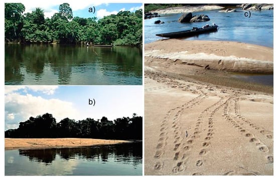 Nichare River, showing high flow (a), nesting grounds exposed during low flow (b), and tracks left on the beach by female Podocnemis unifilis during their nesting forays (c).