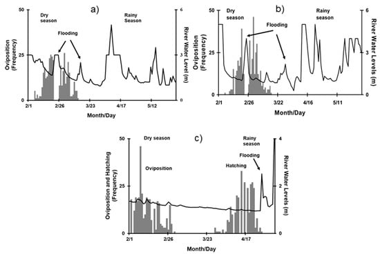 No significant relationship was found between daily nesting activity and rainfall, similar to other river turtles (e.g., Chrysemys picta, []). However, nesting in our study was concentrated at the time of the year when water levels are decreasing and nesting grounds emerge, as observed in other localities (i.e., Capanaparo River, Venezuela, []; Aguarico River, Ecuador, []; Solimões River, Brazil, []), in other Podocnemididae species (e.g., P. expansa [] and P. sextuberculata []), and other river turtles (e.g., Tryonix muticus [], Apalone mutica and Glyptemys insculpta []). Yet, it was surprising to find little relationship within the nesting period between river water levels and nesting activity in our study, and to detect a positive correlation between the number of nests laid and river level. Indeed, there was no significant relationship between nesting activity and river levels for 1999 and 2000, but in 2001 (a year with no flooding until after hatching; Figure 3c) the number of nests laid was positively associated with river levels. A closer inspection of Figure 3c resolves this apparent paradox. Figure 3c reveals that nesting activity in 2001 took place during a time of the year when the general trend of the water level was decreasing. These lower levels are part of the yearly cycle that exposes nesting grounds during the dry season. Early in the season, nesting intensity increased and reached a peak as the river level was dropping, but later in the season when fewer females were left to nest, the number of nesting events decreased as the river continued to fall.