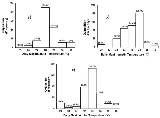 Every year, a normal distribution provided a better fit to the ovipositon data than a uniform distribution (1999: TNormal = 4.77; TUnif = 10.73; 2000: TNormal = 3.27; TUnif = 10.46; 2001: TNormal = 3.15; TUnif = 7.59). This indicated that nesting events were concentrated at intermediate temperature values (Figure 4a–c), yet that value changed annually (28 °C in 1999, 34 °C in 2000, and 33 °C in 2001). We also observed a seasonality in daily maximum air temperature with increasing temperature over the reproductive season that was more marked in some years than others (Figure 5a–c).