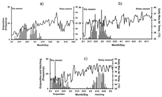 Seasonality in daily maximum air temperature (solid black line) and nest numbers (grey bars at the left side) with increasing temperatures over the three reproductive seasons: (a) 1999, (b) 2000, and (c) 2001. Fluctuations are more marked in some years than others. For year 2001, grey bars at the right side represent the hatching portion.