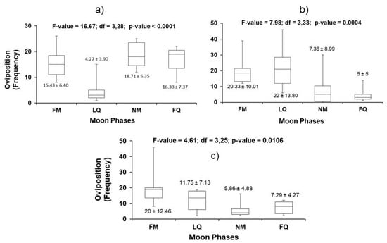 Box-plot with error bars of the analysis of variance (one-way ANOVA) results comparing the average number of nests oviposited per day for the four phases of the lunar cycle (full moon—FM, last quarter—LQ, new moon—NM, first quarter—FQ) over the three reproductive seasons: (a) 1999, (b) 2000, and (c) 2001. Numbers below or above the error bars represent the average and standard deviation (average ± SD).