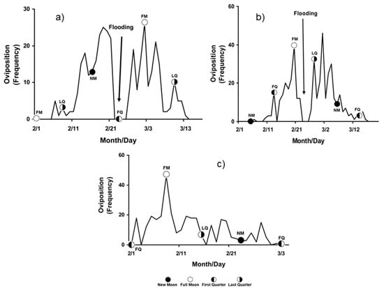 Understanding the mechanisms underlying reproductive patterns may provide important insights into life history evolution and it is a central question in evolutionary ecology [,]. For oviparous animals living in seasonal environments, producing progeny is usually restricted to a brief period during the year; thus, the timing of oviposition is a life-history strategy that plays a critical role for reproductive success and individual fitness []. Indeed, early oviposition is often characterized by having greater offspring survival than later oviposition [,]. Usually, egg-laying coincides with the peak of food availability both in terms of quantity and quality (e.g., snakes [] and birds []) and this timing ensures adequate developmental time for eggs to hatch synchronously and reduce predation risk (e.g., lizards [] and turtles []). But what factors are used by females to time their nesting and are those decisions shaped by natural selection? Local environmental factors have been reported to mediate the fitness effects of the timing of nesting and these factors are thought to influence maternal decisions, given that they may provide cues that mothers can use to calibrate their oviposition to when conditions are the most favorable in order to maximize their lifetime reproductive success [,]. For instance, ambient (or water) temperatures correlate with the start of the nesting season in some birds [], sea turtles [] and amphibians []. Similarly, rainfall stimulates oviposition in many amphibians [] and lizards [], whereas water level influences spawning events in some fishes [].