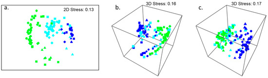 Non-metric multidimensional scaling (nMDS) plots of (a) primary cover, (b) understorey cover and (c) mobile invertebrates assemblages associated with different natural levels of Hormosira cover prior to manipulation (full cover = dark blue, patchy cover = aqua, negligible cover = green) at each of four sites (13th Beach = triangles, Bridgewater Bay = circles, Point Roadknight = squares, Sorrento = diamonds). All data were fourth-root transformed. 3D nMDS plots are shown where stress exceeded 0.20 for 2D plots.