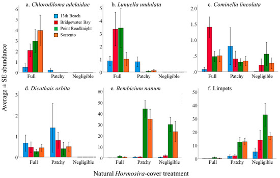 (a) Average ± SE densities of mobile invertebrates (per 0.09 m2 quadrat) amongst natural Hormosira cover treatments for each of four sites: (a) Chlorodiloma adelaidae, (b) Lunella undulata, (c) Cominella lineolata, (d) Dicathais orbita, (e) Bembicium nanum, (f) Limpets (Siphonaria spp., Cellana tramoserica, Patelloida spp. combined). N = 5 for all treatments at 13th Beach and Bridgewater Bay and N = 10 for Point Roadknight and Sorrento.