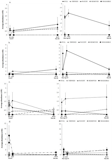 Comparisons of species assemblages associated with both different natural levels of Hormosira cover and experimental manipulations of Hormosira canopy cover were assessed with multivariate analyses using PRIMER 6 version 6.1.1 and PERMANOVA + version 1.0.5 (PRIMER-E Ltd, 2013, Plymouth, UK). Differences in primary cover, understorey cover and mobile invertebrate assemblages between Hormosira-cover treatments were visualised separately for natural and manipulated covers using Non-metric Multidimensional Scaling (NMDS) [34] based on Bray-Curtis dissimilarities. Ordinations were accepted if stress values were < 0.20 and ideally < 0.10 (as recommended by Reference [35]). Shepherds Plots were examined to confirm the goodness of fit. Two-factor permutational multivariate analyses of variance (PERMANOVAs) were performed on fourth-root transformed data with 999 permutations for both natural (baseline) and manipulated covers, examining primary cover, understorey cover and mobile invertebrate assemblages separately. For comparisons of assemblages associated with different natural levels of Hormosira cover prior to manipulation, treatments (three levels: full, patchy, negligible; fixed) and sites (four levels: 13th Beach, Bridgewater Bay, Point Roadknight, Sorrento; random) were compared by PERMANOVA, but because logistical constraints prevented starting experiments and sampling all sites at the same times, any temporal differences in assemblages is incorporated into the unexplained residual variation in analyses. To examine the influence of experimental manipulation of Hormosira canopy cover on associated assemblages, treatments (five levels: full, patchy, negligible, thinned, removed; fixed) and sites (two levels: 13th Beach, Bridgewater Bay; random) were compared by PERMANOVA at each of days 1, 5, 15/19, and 371/379 since experimental manipulation. Tests for homogeneity of dispersions within treatment groups were performed using PERMDISP [36] with distance to centroids. When the treatment × site interaction was significant another PERMANOVA was run on the interaction term comparing treatments individually by site. In these cases, the P-value based on Monte Carlo random draws, P(MC) was selected as it is more robust with the reduced number of possible permutations in pairwise tests [36]. Similarity Percentages (SIMPER) was used to assess the contributions (> 10%) of individual taxa/cover-groups to the separation of treatments. Repeated measures analyses of variance (rmANOVA) were then used to determine the differences in abundances of individual taxa/cover-groups identified by SIMPER amongst treatments and between sites over time (at days 1, 5, 15/19, and 371/379 since experimental manipulation). The physical factors of temperature and light intensity; and the covariates sand depth and Hormosira frond length were also analysed using rmANOVA amongst treatments and between sites over time. All univariate analyses were conducted using SYSTAT version 10 and α = 0.05 for all statistical analyses. Assumptions of rmANOVA were assessed by examination of probability and residual plots; the abundance of individual mobile invertebrates was square root transformed, otherwise no data transformations were necessary.