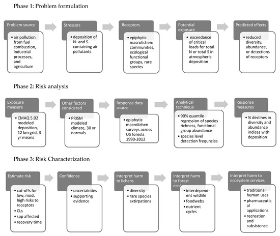 While these CLs may be broadly protective of forest vegetation, how would a manager or regulator evaluate the ecological risk accompanying their exceedance within a particular site or management unit? And more directly, how would different levels of air pollution impact core mission goals? We answer these questions using lichens as a model receptor and the US EPA’s framework for ecological risk assessment [23,24], below: