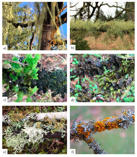 Figure 2. Epiphytic macrolichens exemplifying (a) pendant forage lichens, (b) shrubby forage lichens, (c) large cyanobacterial lichens (cyanolichens), (d) small to medium cyanolichens, (e) medium to large matrix lichens, and (f) small matrix lichens. Near Philomath, western Oregon. Photo credit: (f) Jim Riley. - Detection frequency of individual species of conservation concern—building on the data and species level sensitivity ratings from our previous study [19].