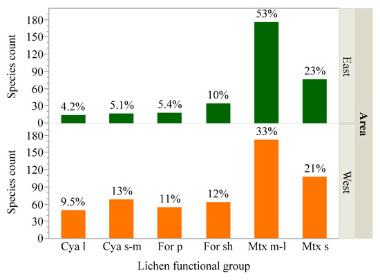 Species richness of matrix lichens was similar in the eastern and western US, but species richness of forage and cyanolichens was higher in the west. Forage and cyanolichens also comprised a higher percentage of western, compared to eastern, species. Values above bars indicate the percentage of species in that functional group for the East or West. Abbreviations: Cya = cyanolichen, For = forage lichen, Mtx = matrix lichen, l = large, s-m = small to medium, sh = shrubby, s = small, m-l = medium to large.