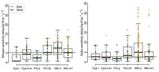 Box and whisker plots of lichen sensitivity ratings by functional group. Boxes enclose 25–75% quantiles, whiskers mark upper and lower outliers (1.5 times the interquartile range). The horizontal line indicates the overall median for the pollutant. Very few cyanolichens or pendant forage lichens were tolerant to S or N (sensitivity rating > 8 kg ha−1 y−1). Medium to large matrix lichens exhibited the broadest range of sensitivities. Abbreviations as in Figure 3.