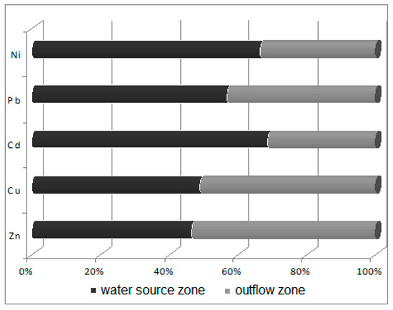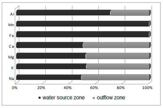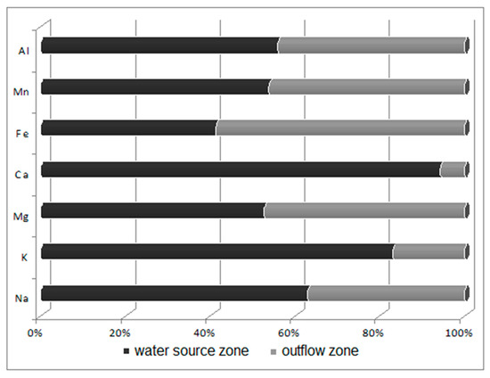 Potametum alpini occurs within an irregularly shaped shallow limnocrene karst spring, located in the distal part of the flood terrace of the Odra River. The zone of outflow of underground waters can be classified as of the type occurring at the edge of a valley lying in the direct zone of the flood waters [33]. Alkaline sediments (pH 8.03) occur within the substratum, while sediments with a lower pH (7.73) occur in the spring’s outflow zone towards the Odra River. The reaction of this substratum shows that the nutrients are characterized by limited mobility. Laboratory analyses revealed that the bottom sediments in the spring zone are abundant in calcium (44,038.45 ppm Ca/kg), iron (5843.50 ppm Fe/kg), aluminum (3400.5 ppm Al/kg) and magnesium (1138 ppm Mg/kg), with the remaining compounds found in smaller concentrations of below 1 g/kg (K > Zn > Na > Pb > Ni > Cu > Cd). Sediments in the outflow zone towards the Odra River are characterized by lower concentrations of macroelements (Figure 4) and heavy metals (Figure 5). It is found that the waters are mineralized at a level of 750 mg/dm3, i.e., at a higher level than recorded during studies conducted in 1978–83 at the same site [33]. Such high mineralization and contents of sulfates, calcium and magnesium indicate that the water leaches calcites and dolomites from the substratum. The water analyzed showed a slightly alkaline reaction, with pH varying from 7.16 directly in the spring to 7.2 in its outflow zone. These waters were well oxygenated: the content of dissolved oxygen was relatively high, at 12.8 mg O2/dm3, in the water source, but lower in its outflow zone, at 8.27 mg O2/dm3. The water temperature in the water source (at depths of 0–20 and 20–40 cm) was 9.6 °C, and 9.7 °C (0–20 cm below the water level) in the outflow zone. The literature data [33,34] also suggest a relatively narrow range of changes in water temperature in the limnocrene spring, of about 1 °C, with temperatures ranging from 9.4 to 10.4 °C.