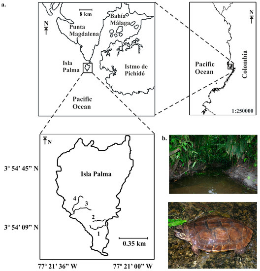 With 27 species of terrestrial and freshwater turtles, Colombia is considered the seventh most species-rich country in the world, and third at the level of South America behind Brazil and Ecuador [28]. Despite this great diversity, turtles are far from being one of the best-studied animal groups in Colombia; many aspects of their basic biology remain unknown, and long-term research is almost nonexistent or just beginning to be published [29,30]. Among the freshwater turtles recorded in Colombia, the Chocoan River Turtle, Rhinoclemmys nasuta (Geoemydidae), is found only in Colombia and Ecuador [31], and its conservation status is categorized as near-threatened (NT) globally [3], NT in Colombia [32], and endangered (E) in Ecuador [33]. As a consequence of the threatened status of this species, we began studying an island population of R. nasuta in 2005 on Isla Palma, Bahía Málaga, in the central Pacific coastal region of the Department of Valle del Cauca in Colombia [31,34].