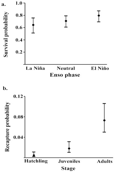(a) ENSO phase survival probability, and (b) stage-specific recapture probability for the Chocoan River Turtle on Isla Palma estimated using multi-state mark-recapture models (error bars = 95% confidence interval).
