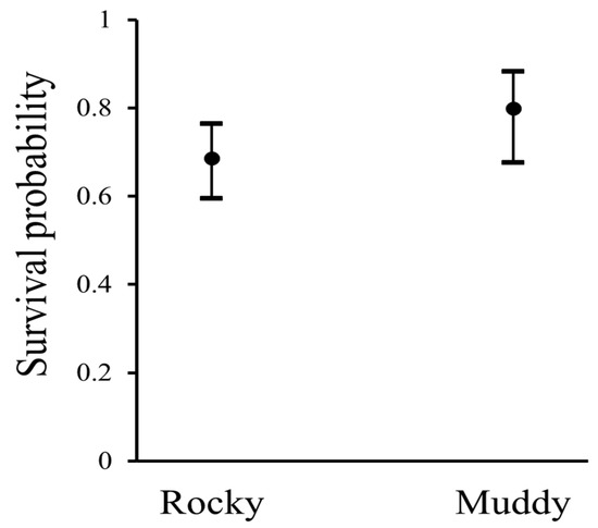 Survival probability in relation to stream substrate type for the second-best model for the Chocoan River Turtle on Isla Palma estimated using multi-state mark-recapture models (error bars = 95% confidence interval).