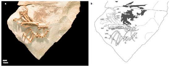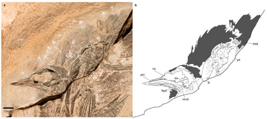 The sclerotic ring in DK664 (Figure 3) appears to be dorsoventrally and lateromedially robust, although it is only partially preserved, precluding a reliable assessment of phylogenetically relevant morphology. Apparent melanin from the eye, preserved just above the remains of the sclerotic ring, was reported by a previous study []. The supraorbital crest and temporal fossa are too poorly preserved to confidently assess.
