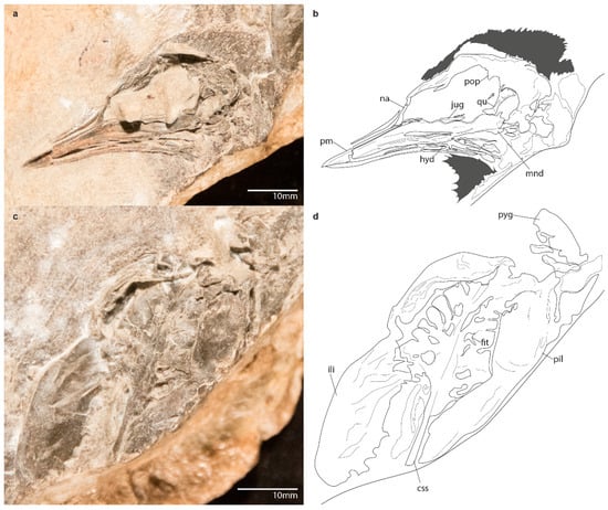 Photographs (a, skull in lateral aspect and c, pelvis in dorsal aspect) and line drawings (b, d) of the holotype specimen of Pellornis mikkelseni, MGUH 29278. Soft tissue and plumage is filled in with gray. Dashed borders indicate bone that is extremely broken. Anatomical abbreviations: pm premaxilla, na narial bar, pop postorbital process, pal palatines, qu quadrate, jug jugal, mnd mandible, hyd hyoids, ili preacetabular ilium, pil postacetabular ilium, fit foramen intertransversarium, pyg pygostyle.