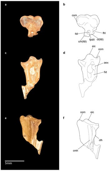 In the holotype specimen and FUM 1681a, splint-like intratendinous ossifications are present adjacent to both the forelimb and hindlimb bones (Figure 5). Intratendinous ossifications are present along the carpometacarpus and phalanx proximalis digiti majoris of the holotype specimen, with one markedly more elongate ossified tendon located along the cranial margin of the distal end of the carpometacarpus (Figure 1). The ossified tendon is approximately one-third the length of the carpometacarpus, although this may not represent its true length as Bertelli et al. [] note that it is likely incomplete. Presence of such an elongate ossified tendon along the carpometacarpus is also observed in many M. cristata specimens and extant members of Gruidae. In FUM 1681a, a mass of strongly developed ossified tendons are present along the medial edge of the femur and just distal to it; whether these were associated with the femur in vivo is difficult to assess in this disarticulated specimen. The ossifications are elongate and extend along the length of the femur. Intratendinous ossifications that appear thinner and more elongate than those of the forelimbs are arranged in a fan-like shape along the cranial and caudal margins of the distal shaft of the tibiotarsus. These have been tentatively ascribed to the tendons of the m. gastrocnemius []. Long ossified tendons along the tibiotarsus are also present in Messelornis nearctica, in which they are similarly extensive but distinctly more robust [].