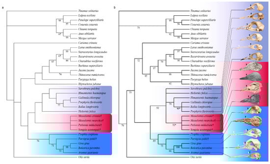 Strict consensus tree of 30 MPTs recovered from unconstrained heuristic parsimony analysis (a, steps = 325, CI = 0.357, RI = 0.701, RC = 0.250, HI = 0.643) and strict consensus tree of 48 MPTs recovered using the Prum et al. [] tree as a molecular backbone constraint (b, steps = 333, CI = 0.348, RI = 0.690, RC = 0.240, HI = 0.652). Crown Ralloidea are highlighted in violet, crown Gruoidea are highlighted in blue, and included extinct ralloid taxa are highlighted in crimson (Messelornithidae and Songzia acutunguis). All extinct taxa are denoted with daggers. Bootstrap support values greater than 50% are denoted below branches. Black arrows in extant skulls denote the craniofacial hinge, with white arrows representing additional bending axes along the dorsal bar following Zusi []. Black arrows in fossils represent the level of the craniofacial hinge as bending zones cannot be determined in fossils. Photographs of skulls from top to bottom: Sarothrura pulchra USNM 291778, Heliornis fulica USNM 19159, Himantornis haematopus USNM 318591, Gallinula chloropus USNM 603455, Rallus longirostris USNM 501940, Porphyrio flavirostris USNM 623070, Messelornis cristata (composite photo made from Tafel III:8 and Tafel IV:10) [], Messelornis nearctica [] Pellornis mikkelseni MGUH 29278, Songzia acutunguis [], Psophia crepitans USNM 429974, Parvigrus pohli [,], Grus grus USNM 610382, Balearica pavonina USNM 320869, Aramus guarana USNM 612025.