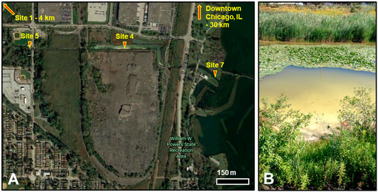 Site 7 lies upstream of Site 4 on the western side of Wolf Lake in the William W. Powers State Recreational Area, near the mouth of Indian Creek. The lake’s water is circumneutral (pH 7–9) and negligibly affected by slag fills in the area [19]. The lake is populated with various fish and other aquatic life that draws visitors for recreational fishing.