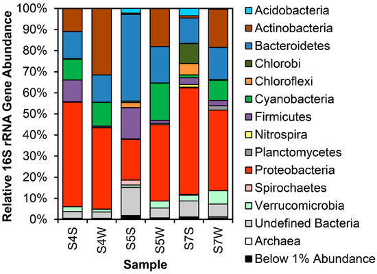 Figure 2. Phylum-level 16S rRNA gene relative abundances at sites 4, 5 and 7 around the Calumet Wetlands. All samples were collected in August 2013. S*W and S*S denote soil and water samples from the corresponding site.