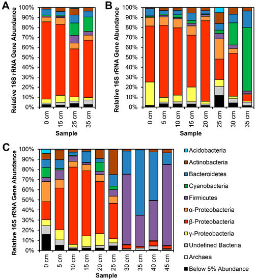 Figure 3. Phylum- and Proteobacterial class-level 16S rRNA gene relative abundances in three horizontal transects collected at Site 4: (A) 35 cm transect collected at Spring A in April 2014. (B) 35 cm transect collected at Spring B in April 2014. (C) 45 cm transect collected at Spring A in July 2014. Transects started inland at each spring seep, ca. 15 cm from the waterline. Samples were collected from the top layer of soil (on land) or upper layer of sediment (in the canal water column).