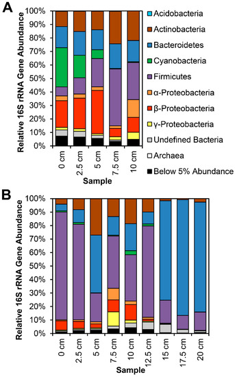 Figure 4. Phylum- and Proteobacterial class-level 16S rRNA gene relative abundances in two vertical transects collected at Site 4: (A) 3 cm diameter core collected in April 2014; (B) 7.5 cm diameter core collected in March 2015. Depth indicates the top side of each core segment, starting at the top of the calcium carbonate flocculent. Water column is not included, but averaged 5–10 cm above sediment.