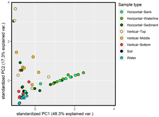 Figure 5. PCA plot of genus-level 16S rRNA gene abundance data for all Calumet area samples. Principle components 1 and 2 shown, which together explain 65.6% of variance.
