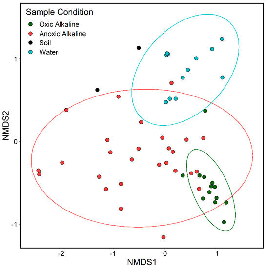ANOSIM results (Figure S3) shows that mean difference between samples is higher than the differences within the oxic alkaline, anoxic alkaline and water sample groups. Oxic alkaline samples have the least within-group difference. Each group can be considered distinct, though their quartiles show some overlap. This assessment does not extend to circumneutral soil samples, of which there were too few to estimate the distribution.