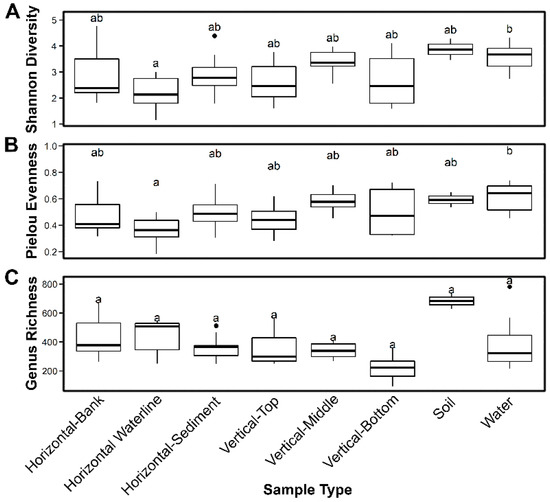 Figure 7. Genus-level statistical measurements of Calumet samples: (A) Shannon (alpha) diversity; (B) Pielou evenness; and (C) richness. Means are marked with a heavy black line, and hinges indicate the first and third quartiles. Whiskers indicate the range of values outside these quartiles. Outliers (farther than 1.5 × the interquartile range) are indicated by black circles. Similarity groups at 95% confidence are indicated by letters a and b.