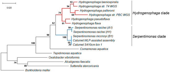 Read recruitment by multilayer perceptron produced another draft Hydrogenophaga genome with 2.9 Mbp genome size and 100% completeness as reported by CheckM. RAST annotations showed the presence of putative carboxysome shell proteins and the large subunit of ribulose bisphosphate carboxylase, indicating the ability to fix inorganic carbon, and hyaA/hyaB hydrogen utilization genes. Presence of CO2 fixation subsystems without evidence of light-harvesting complexes suggests that these signatures are genuine, and not the result of cyanobacterial contamination in the assembly. These annotations match similar activity in Serpentinomonas strains reported in Suzuki et al. [14]. Other annotated functions include Gram-negative cell wall components, capsule- and EPS-related genes, several ABC transporters, metal compound resistance genes, and systems for chemotaxis and flagellar motility. Ten prophage genes were annotated, but no transposable elements. Sequence alignment with representatives of known Hydrogenophaga, Serpentinomonas and neighboring bacterial families produced a Maximum Likelihood phylogenetic tree showing the draft genome clustering within the Serpentinomonas clade (Figure 8) with S. mccroryi and S. rachei [14]. Serpentinomonas raichei and Serpentinomonas mccroryi were recently renamed, and are referred to as Comamonadaceae strains A1/H1 and B1 in the original publication [14].