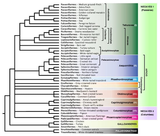 - Braun, E.L.; Cracraft, J.; Houde, P. Resolving the avian tree of life from top to bottom: The promise and potential boundaries of the phylogenomic era. In Avian Genomics in Ecology and Evolution—From the Lab into the Wild; Kraus, R.H.S., Ed.; Springer: Cham, Switzerland, 2019. [Google Scholar]