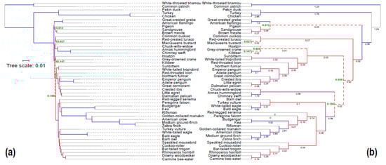 - Jarvis, E.D.; Mirarab, S.; Aberer, A.J.; Li, B.; Houde, P.; Li, C.; Ho, S.Y.W.; Faircloth, B.C.; Nabholz, B.; Howard, J.T.; et al. Avian Phylogenomics Consortium Phylogenomic analyses data of the avian phylogenomics project. Gigascience 2015, 4, 4. [Google Scholar] [CrossRef]