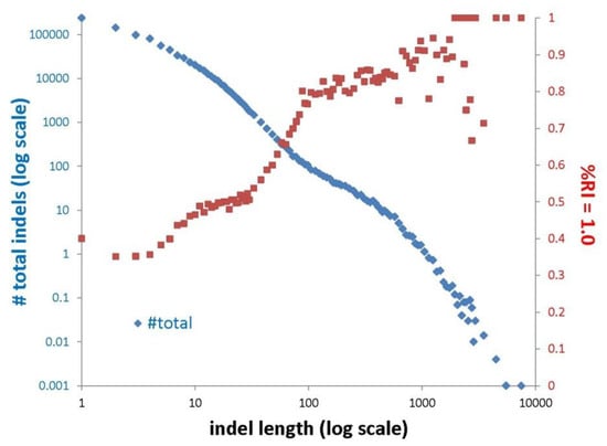 Measured (apparent) homoplasy represents three distinct phenomena that contribute to character state distributions that conflict with an estimate of the species phylogeny. These phenomena are: (1) true homoplasy (convergence, reversal, and parallelism), (2) hemiplasy (characters that are perfectly consistent with their underlying gene tree but conflict with the species tree due to ILS [64]), and (3) analytical errors (e.g., alignment errors). Ensemble RI provides a metric of homoplasy relative to a specific estimate of the species tree, and it includes all three sources of apparent homoplasy (including error introduced by inaccurate estimation of the species tree). As expected, based on prior studies, all indel size classes have lower homoplasy (higher RI) than nt substitutions (nt RI is 0.31 whereas indel RI ranges from 0.49 to 0.86 depending on the indel size class; Table 2). If we focus on the fit of individual indels to an estimate of the species tree, using the percentage of indels with perfect fit to the tree (RI = 1.0), we see a similar size dependence (Figure 3). The number of indels falls off sharply as a function of indel size, probably reflecting the complex mixture of phenomena that lead to the accumulation of indels over evolutionary time. First, mutational origin of indels is heterogeneous, with very small indels reflecting phenomena like replication slippage followed by a shift to unequal crossing-over for somewhat larger indels and finally arriving at the largest size class, that is likely to include many TE insertions. Han et al. [65] examined a set of avian introns and found that 73% of insertions that were >40 bp in length were TE insertions. Second, the probability of indel fixation may differ for indels of different sizes. Regardless of the differences within indels, these data confirm previous work showing that indels are less homoplastic than nt substitutions [35,38] and they are likely to provide a useful source of phylogenetic information.