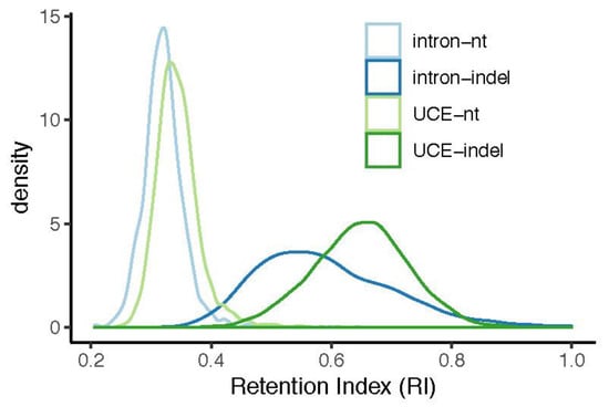 Frequency distribution of ensemble retention index (RI) calculated using individual gene trees by intron indel gene trees, UCE indel gene trees, intron nt gene trees, and UCE nt gene trees. Ensemble RI of individual loci should provide a more accurate measure of homoplasy than RI of species trees by minimizing the role of hemiplasy. Indel gene trees exhibit substantially higher RI than nt gene trees.