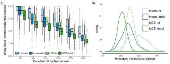 Resolution of both intron and UCE nt gene trees is superior to that of indel gene trees. Indel gene trees are less resolved as binary trees than nt gene trees for any cutoff of BS support (contraction), despite differences in resolution between intron and UCE partitions (Figure 5a). With contraction of only branches with 0% support, the median (across loci) number of binary nodes recovered normalized to the maximum possible is 100% for intron nt gene trees, somewhat less for intron indel and UCE nt gene trees, and substantially lower for UCE indel gene trees. The median percentage of recovered nodes drops rapidly and monotonically to below 50% of the maximum possible as nodes are contracted up to 33% based on BS support. UCE gene trees are less resolved than intron gene trees within each data type. The relative differences between data types and partitions remain the same at all levels of contraction. Similarly, mean BS support averaged over all branches of each gene tree is higher for nt gene trees than indel gene trees, despite differences between intron and UCE partitions (Figure 5b).