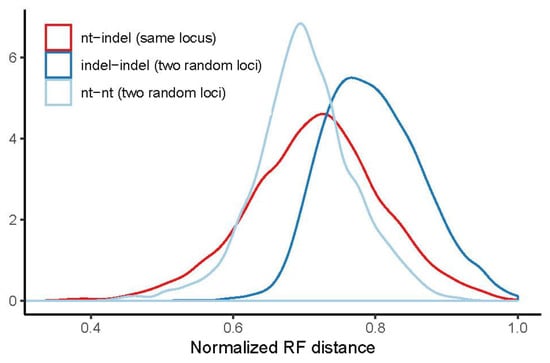 RF distances for intron gene trees. Density of normalized RF distances between indel and nt gene trees of the same locus (red) are compared to distances between randomly sampled indel gene trees and randomly sampled nt gene trees. Randomly sampled nt gene trees are slightly more congruent with one another than indel and nt gene trees of the same locus. Indel and nt gene trees of the same locus are substantially more congruent with one another than randomly sampled indel gene trees. Similar patterns are observed for UCE gene trees (Figure S9).