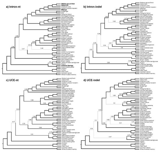 There are numerous topological differences between combined UCE+intron nt and UCE+intron indel trees (Figure 11c,d, respectively). Most notable among these are the repositioning of Phoenicopterimorphae from Columbea to a pan-waterbirds clade and movement of Hoatzin from sister to Cursorimorphae to the pan-waterbirds clade, with concomitant reductions to below 90% in localPP support for the indel tree. Alternate sisterships of egret+pelican and ibis+pelican are strongly-supported by both trees. The position of owl+Accipitrimorphae as sister to all other Telluraves in the indel tree is better supported than it is as sister to Coraciimorphae in the nt tree (100% vs. 78%). Caprimulgiformes and Otidimorphae also reversed positions with low support in both trees. Support for the same position of Phaethontimorphae was significantly lower in the indel tree.