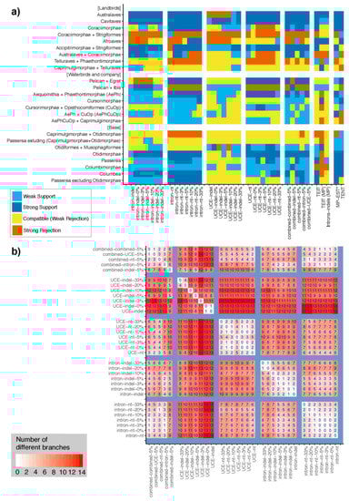 (a) For each focal relationship (i.e., those with some conflict), we show whether they are recovered or rejected in various trees with high or low support, defined by a threshold of 95% support. Three relevant trees from the Jarvis dataset and two MP indel trees are also included. Note that support values are localPP for ASTRAL trees and BS support for concatenation trees, including those from Jarvis et al. [15]. See Figure 1 for clade names. Figure created using DiscoVista. (b) The number of different branches between all pairs of ASTRAL species trees.