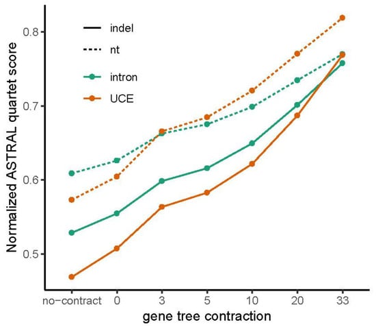 UCE indel trees exhibit relatively higher within- and among-partition RF distances (Figure 9b). For all gene tree contraction levels, the QS was higher for nt than for indels (Figure 10). Similarly, over almost all contraction levels, intron indels have higher QS than UCE indels (Figure 10). This suggests that UCE gene trees may be less precisely resolved than intron gene trees when indels are used. The situation is more complex for nt data; the QS was higher for intron nt trees at low contraction levels, whereas the QS was higher for UCE nt trees when the contraction level was higher (Figure 10).