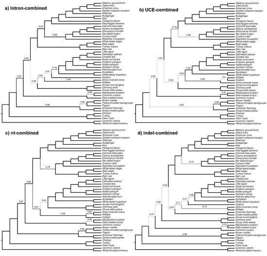 Congruence among trees produced by independent data partitions provide further suggestive evidence that the base of Neoaves is not a hard polytomy. The combined UCE indel+nt tree is very similar to the combined intron indel+nt tree (RF distance = 3; see Figure 9b). Both the combined intron indel+nt tree (Figure 11a) and the combined UCE indel+nt tree (Figure 11b) include the Columbea and Passerea clades as the basal divergence for Neoaves, as in Jarvis et al. [15] and Reddy et al. [18]. Support for both of these clades is limited in the combined UCE indel+nt tree, but the fact that it recovers them at all is significant because neither the UCE nt-only tree (Figure 8c) nor the UCE indel-only tree (Figure 8d) include those clades. Thus, combining indel+nt data increases congruence between the UCE data and the intron data, the latter of which by itself supports the deep divergence between Columbea and Passerea regardless of whether nts (Figure 8a) or indels (Figure 8b) are analyzed. This increased congruence when trees based on indels and nts are combined is not predicted by the hard polytomy hypothesis—it is predicted if these clades are present in the true species tree.