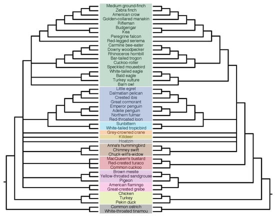 - Prum, R.O.; Berv, J.S.; Dornburg, A.; Field, D.J.; Townsend, J.P.; Lemmon, E.M.; Lemmon, A.R. A comprehensive phylogeny of birds (Aves) using targeted next-generation DNA sequencing. Nature 2015, 526, 569–573. [Google Scholar] [CrossRef] [PubMed]