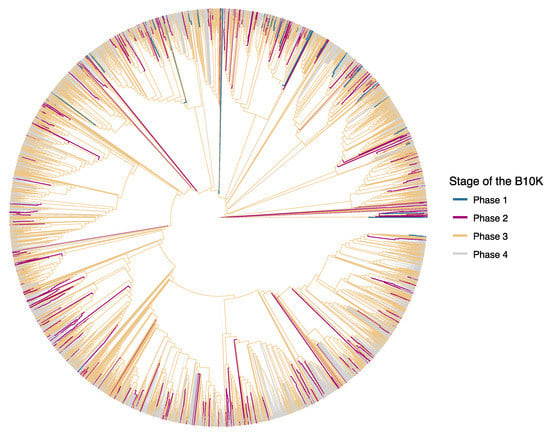 To date, birds are the vertebrate group with the most genomes available for different species. As of May 2019, a total of 456 bird genomes have been sequenced and assembled, of which 147 are available on NCBI. The B10K Consortium is a major contributor of these genomic resources. The B10K sequencing plan is organized into four phases with the ultimate goal to decode the genomes for all bird species [11]. Each phase is sampling the bird tree of life at increasing resolution, moving from deep nodes to increasingly shallower divergences (Figure 1). The first phase of the B10K, the Avian Phylogenomics Project, concluded in 2014 with the release of 45 bird genomes of at least one species from each neoavian order [9,10], hence sampling all of the deepest branches of the phylogeny. The second phase has started in 2017 to sequence at least one representative per family. Sequencing was successful for 218 families (following the taxonomy of Howard & Moore 4th edition [30]) while 18 families could not be represented due to the lack of appropriate samples. Altogether, phase 2 analyzes 363 genomes. Of these, 90 are published, 273 were newly sequenced including 32 still unpublished genomes that were contributed by the community to bolster B10K sampling. The analyses for phase 2 of the B10K are underway to provide a densely sampled phylogeny, new comparative genomics insights and a flood of new data for the community, including a novel whole genome alignment.