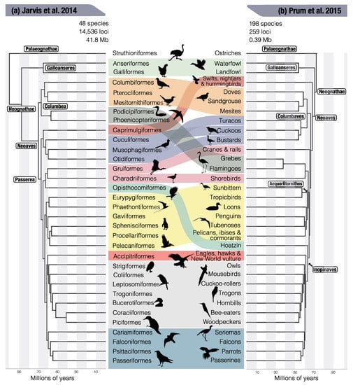 Overview of the main competing hypotheses based on two studies with different strengths in their data acquisition: (a) Sequence-focused analysis of Jarvis et al. [10] based on whole genome sequence data for 48 birds analyzing 8251 protein-coding loci, 2516 introns, and 3679 ultraconserved elements; (b) Taxon-sampling-focused analysis by Prum et al. [42] with 198 species but only 0.4 Mb of conserved coding sequence data. The two hypotheses are difficult to reconcile because of differences in the extent of genomic and taxonomic sampling, the type of loci, and the method of analysis. Clades that are discussed in the text are annotated, for the complete systematic classification the reader is referred to the original studies.