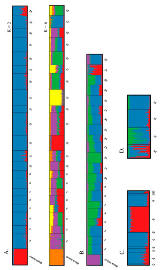 - Pritchard, J.K.; Stephens, M.; Donnelly, P. Inference of population structure using multilocus genotype data. Genetics 2000, 155, 945–959. [Google Scholar] [PubMed]