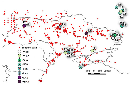 At the same time, the amount of all the animal bones that were examined consisted of more than 80,000 units, among which 1623 turtles’ bones were found. The bones and fragments of carapaces were revealed in osteological materials and studied by the archeozoologist Ye. Yanish. Additionally, the literature data [4,5,6,7,20] was used for the analysis, for which a database was created with 437 record of Holocene turtles. For comparison and GIS-analysis, the extant turtles (2847) were used: GBIF [21], Ukraine (original data of Nekrasova O.), Baltic countries (Latvia, original data of Pupins M. [5,15,16,17,18,19]); Belarus [8,22,23], Russia, and Kazakhstan [24,25,26,27,28].