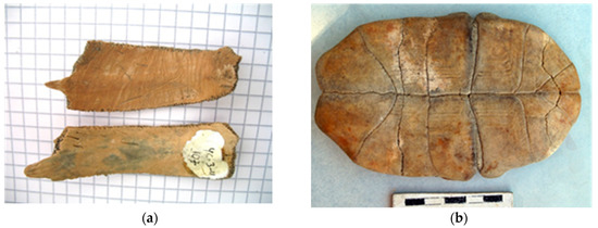 Fragments of the carapace (a) and plastron (b) of a pond turtle: (a, top image)—with sign of kitchen knife cutting, (a, lower image)—without a trace of cutting, for comparison, Neolithic, Cherkasskoe-3 (Voronezh region, Russian Federation, foto Ye. Yanish) and (b)—Antiquity, Olbia (Mykolaiv region, Ukraine, foto A. Buyskikh).