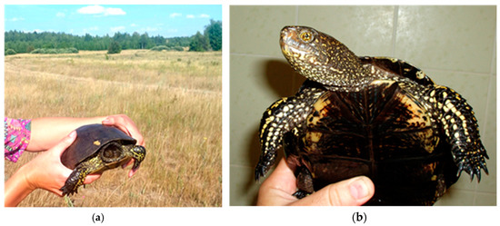 - Drobenkov, S.M. Population Ecology of the European Pond Turtle (Emys orbicularis) in Belarus; Belarusskaja Nauka: Minsk, Belarus, 2012. (In Russian) [Google Scholar]