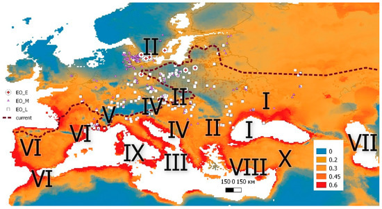 GIS-model of the Early Holocene location of glacial refuges (red) of Europe by E. orbicularis based numerals refer to mtDNA: I-X [3,4,5,43,44,45], Holocene subfossil finds records in Europe: EO_E—Early Holocene, EO_M—Middle Holocene, EO_L—Late Holocene [5,6,7,23], original data), the line displays the current northern distribution border of native populations [3,4,5,7,8,33].
