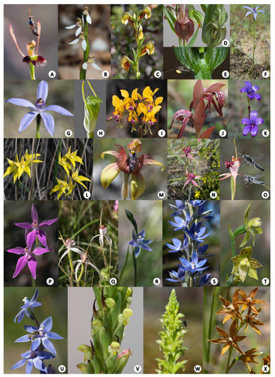 - Weston, P.H.; Perkins, A.J.; Indsto, J.O.; Clements, M.A. Phylogeny of Orchidaceae tribe Diurideae and its implications for the evolution of pollination systems. In Darwin’s Orchids: Then and Now; University of Chicago Press: Chicago, IL, USA, 2014; pp. 91–154. [Google Scholar]